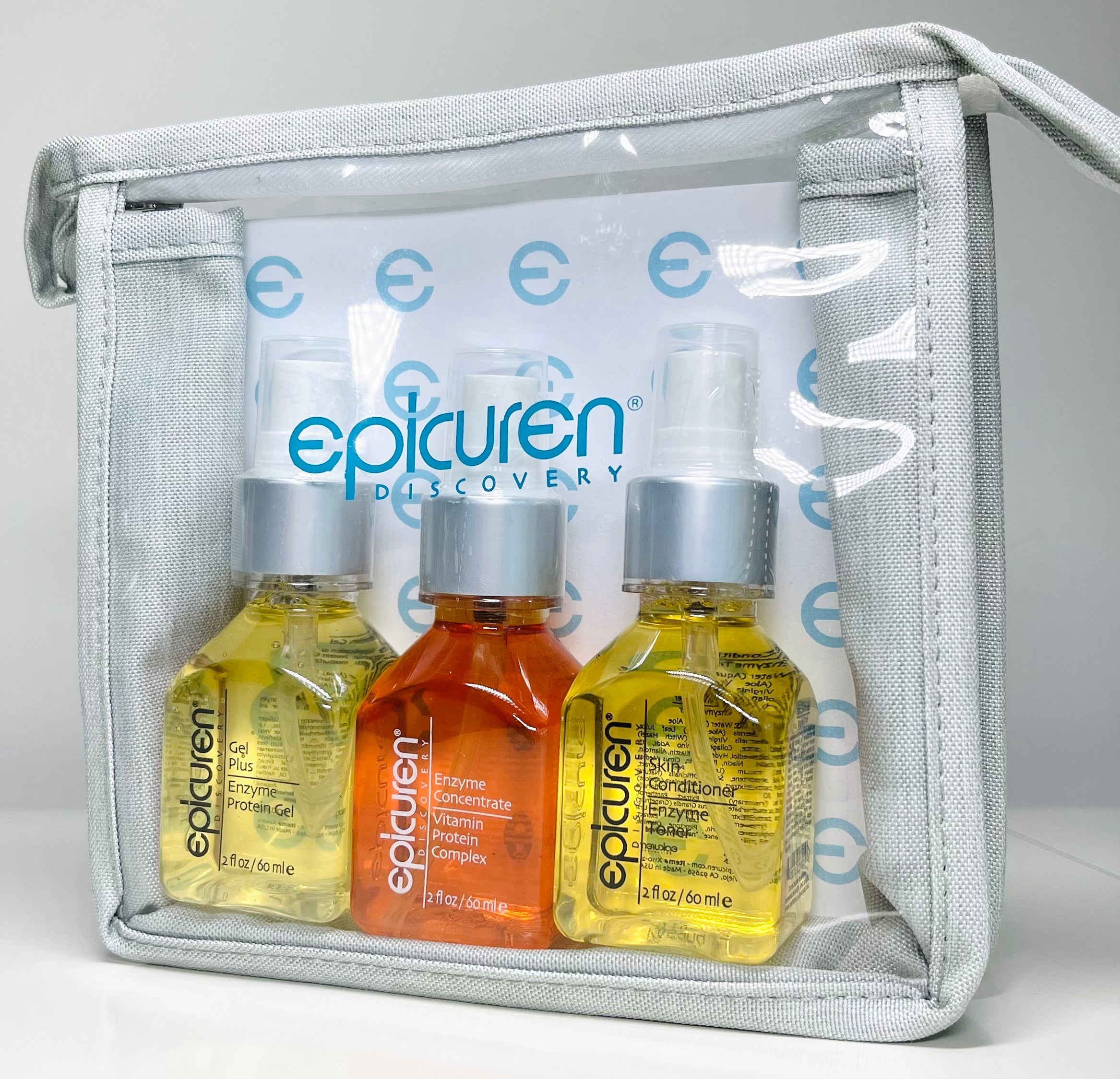 • Three bottles of Epicuren Discovery Metadermabolic Protein Enzyme Complex products, including a Skin Conditioner Enzyme Toner, an Enzyme Concentrate Vitamin Protein Complex, and Gel Plus Enzyme Protein Ge, packaged in a clear travel toiletry bag with the brand's logo and product names visible.