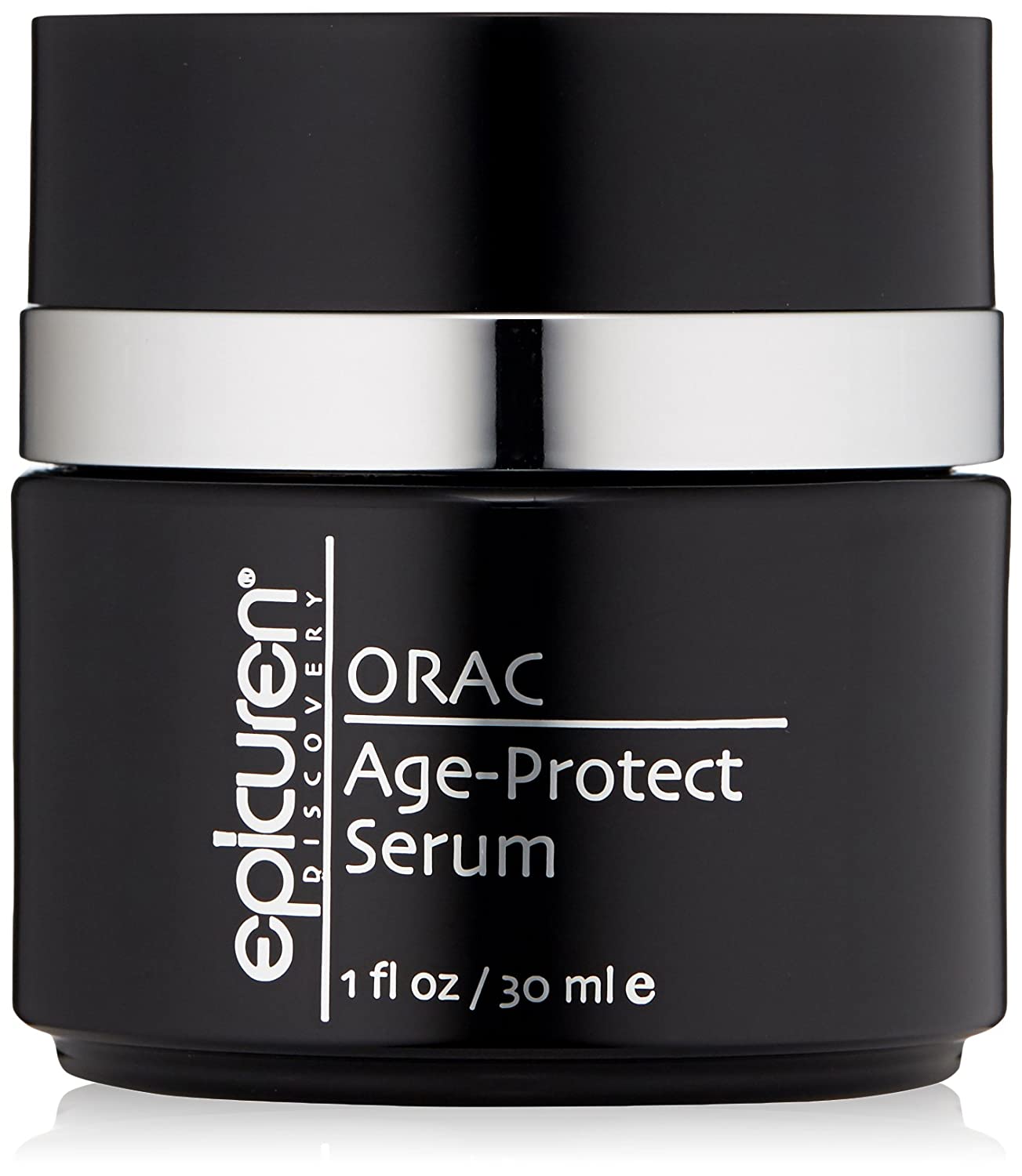 • Epicuren Discovery Orac Age-protect Serum bottle, 1 Fl Oz, with a sleek design, showcasing its anti-aging properties.