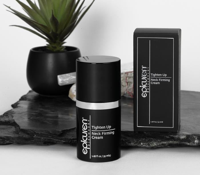 • Epicuren Discovery Tighten Up Neck Firming Cream packaging and container, black and silver in color, 1.18 fl. oz. size.
