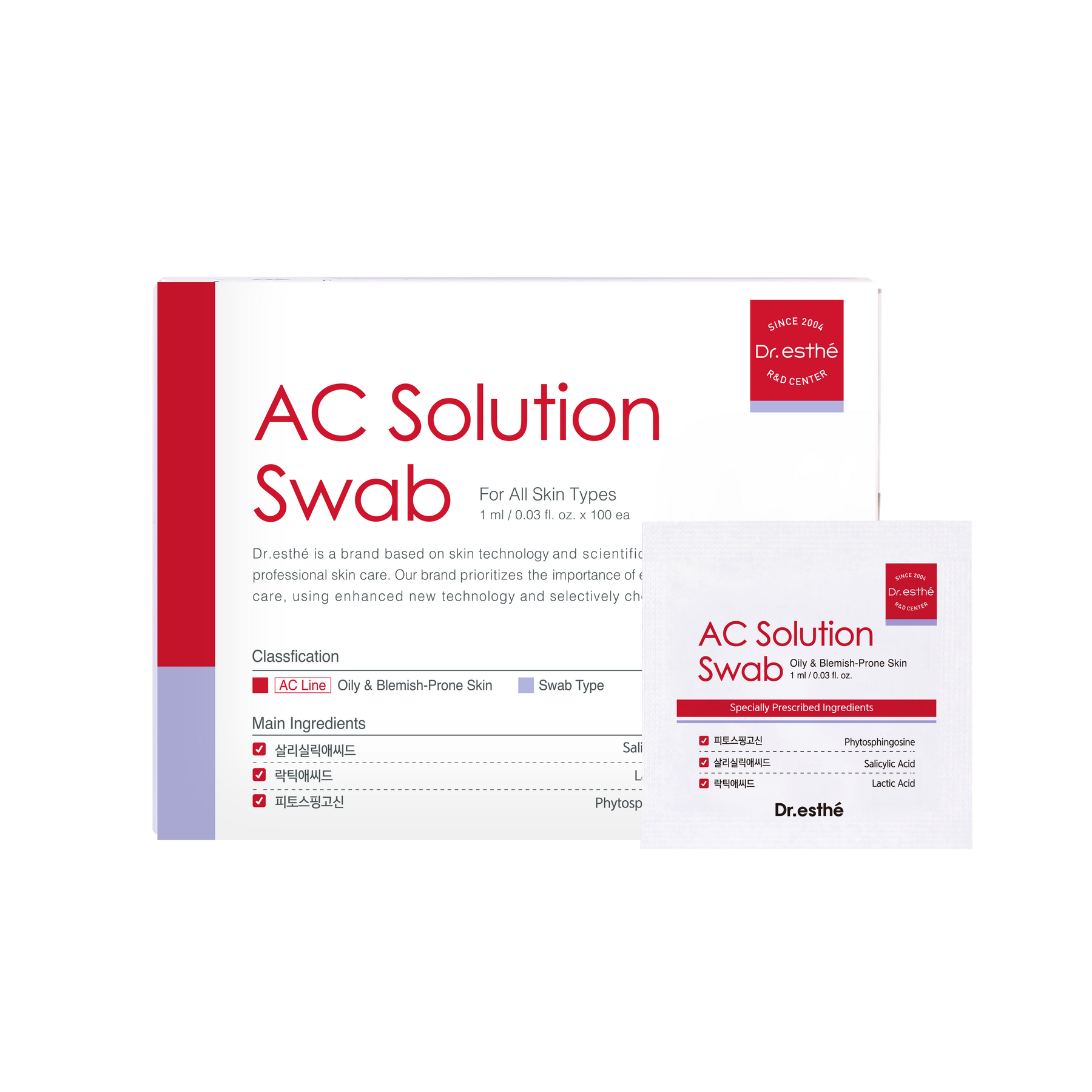 • Dr. Esthe AC Solution Swab pack containing 100 swabs for targeted application and skincare needs.